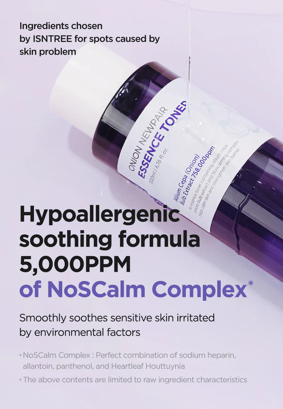A spot care essence toner that helps treat blemishes and spots at one time. Enriched with 75% Muan Red Onion Extract to tackle blemishes. Formulated with NoSCalm Complex (Sodium heparin, Allantoin, Panthenol, and Heartleaf Houttuynia) to soothe sensitive, irritated skin. Contains Tranexamic Acid and Vitamin C derivatives to even skin tone and tackle pigmentation, as well as betaine to moisturize skin.