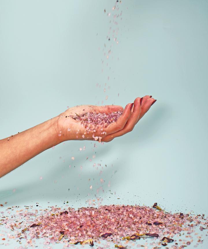 Aromatherapeutic bath salts to transport your body and mind. Scents of palo santo, lavender, and vetiver mingle with butterfly pea powder and flowers to turn bathwater into a rich sapphire hue.